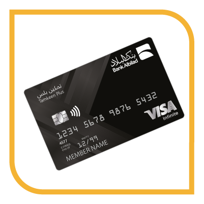 ادخل إلى عالم الفخامة والامتياز مع بطاقة (فيزا) تمكين بلس انفينيت الائتمانية من بنك البلاد. تمنحك البطاقة أفخم تجربة تسوق وسفر عبر باقة واسعة من الخدمات والامتيازات التي تفوق التوقعات وهي خيارك الأمثل حيث تُمكنك من التسوق والشراء عبر الإنترنت أو عبر نقاط البيع أو السحب النقدي بكل سهولة ويسر داخل او خارج المملكة. كما تتميز البطاقة بحد ائتماني اعلى وبإمكانية سداد المبالغ المستخدمة بأقساط شهرية ميسره 5% أو 200 أيهما أعلى، ومتوافقة مع ضوابط اللجنة الشرعية.