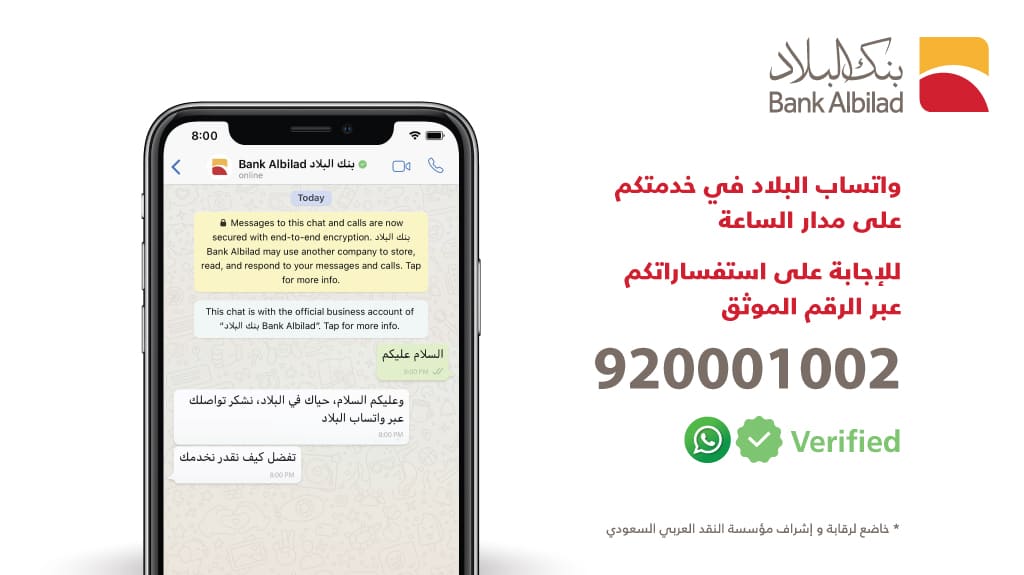 أطلق بنك البلاد خدمة تطبيق الواتساب " WhatsApp "الموثقة على الرقم 966920001002+ لعملائه الكرام لتوفير منصة اتصال تلبي احتياجاتهم ومتطلباتهم على مدار الساعة من داخل وخارج المملكة العربية السعودية ، سعياً من البنك في تقديم منصات اتصال متنوعة وأنظمة متطورة تهدف إلى تحسين تجربة العملاء الكرام وحصولهم على جميع الخدمات المقدمة من بنك البلاد بشكل سهل وسريع وفي أي وقت .