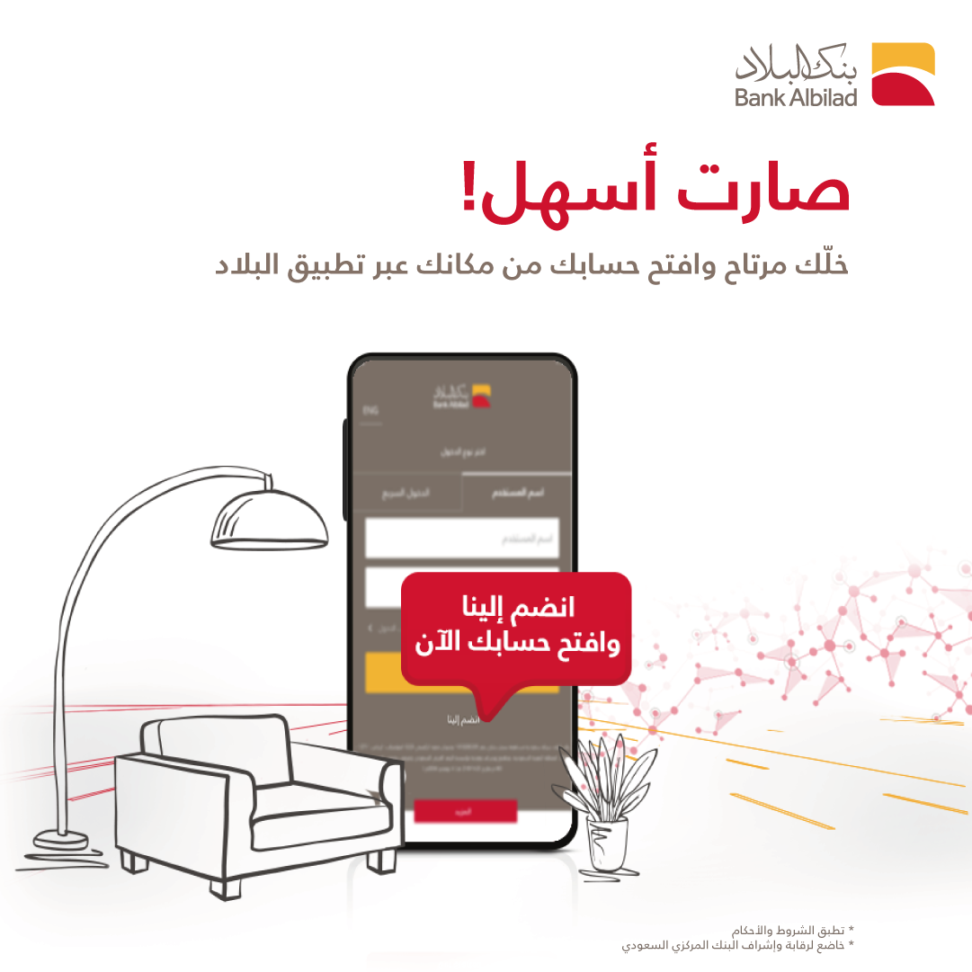 أطلق بنك البلاد خدمة فتح حساب الجاري للأفراد بطريقة رقمية عبر تطبيق البلاد للأجهزة الذكية من أي مكان وخلال وقت قصير دون الحاجة إلى زيارة الفرع نهائياً أو تقديم أي مستندات، ودون الحاجة للتوقيع على أي مستند لفتح الحساب . ويأتي ذلك ضمن خطة البنك للتحول الرقمي لتوفير جميع الخدمات المصرفية بكل سهولة ويسر بطريقة رقمية متقدمة ومبتكرة لجميع العملاء الكرام .